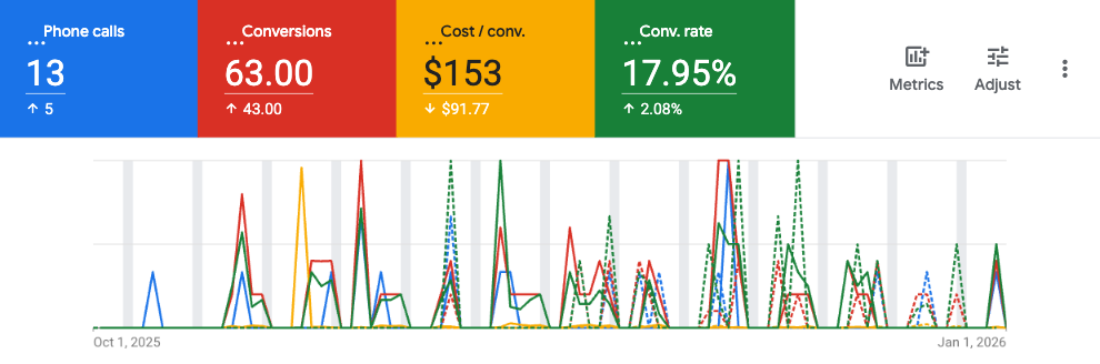 In Q4, this gate services account showed strong performance improvements following a refined campaign structure, with a greater focus on high-intent search categories and the most effective lead sources while reducing spend in lower-performing areas. This shift allowed the platform to optimize more efficiently by concentrating on the services users were actively searching for. Additionally, more budget was allocated to Local Services Ads, as they consistently generated leads at a lower cost compared to standard Search campaigns. As a result, the account experienced a significant increase in conversions while also lowering cost per lead, with mobile users driving the majority of high-intent inquiries.
